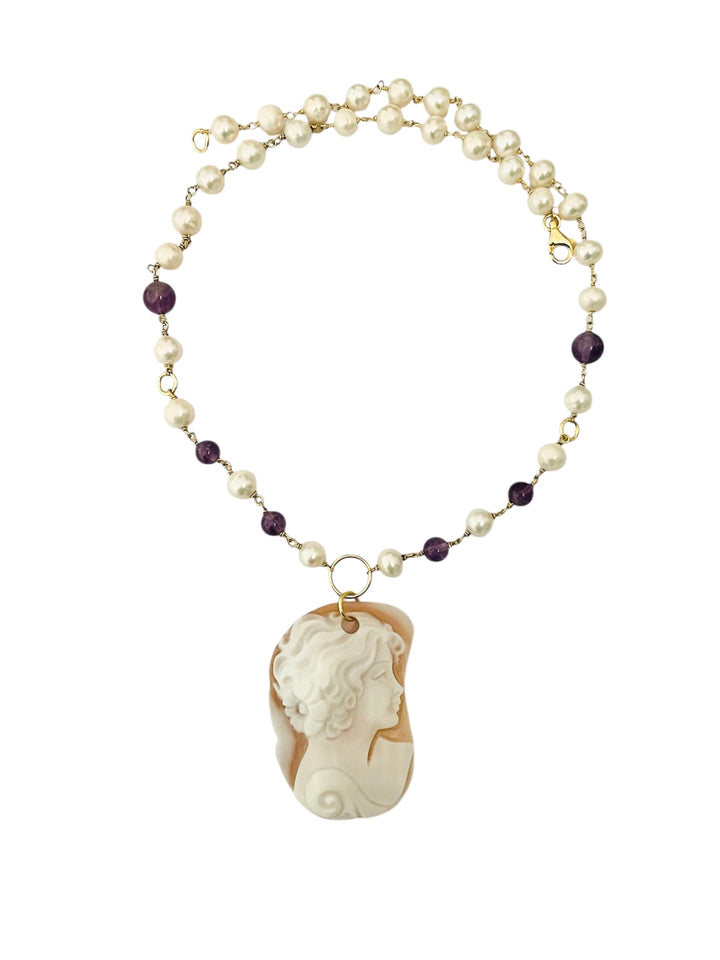 Al centro, un cammeo naturale inciso a mano, di circa 5 cm, raffigura un volto femminile dal fascino senza tempo — un simbolo di eleganza classica reinterpretata in chiave contemporanea.