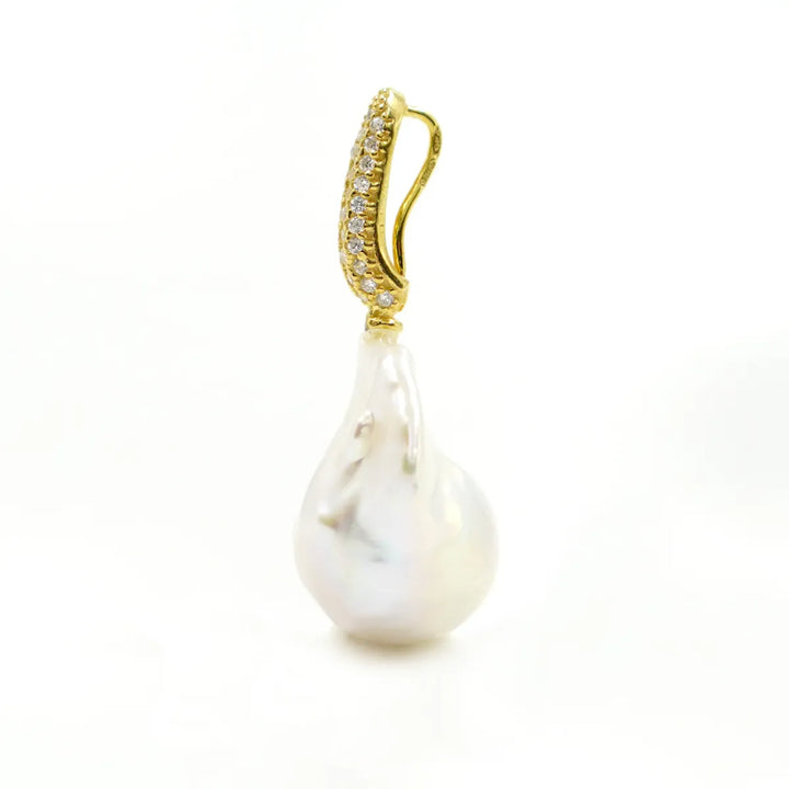 La perla barocca naturale, dal bianco puro e luminoso, rivela la sua forma unica e irripetibile — segno autentico della natura.