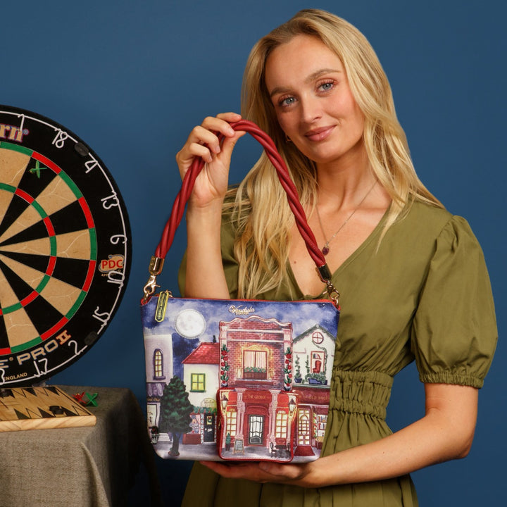 Sentite la tristezza dell'autunno? La Borsa Pippa Cheers Street è qui per risollevarvi il morale! Realizzata in pelle vegana, questa elegante borsa a tracolla è perfetta sia per l'uso quotidiano che per le occasioni speciali. Offre un ampio scomparto principale e numerose tasche interne ed esterne per tenere in ordine i vostri oggetti essenziali. Si può portare come una borsetta o a tracolla grazie all'elegante tracolla con borchie dorate. La decorazione illustrata a mano di Cheers Street, abbinata alla caratteristica fodera stampata Vendula, darà un tocco di classe e originalità al vostro stile stagionale. Non lasciatevi sfuggire questa bellezza!