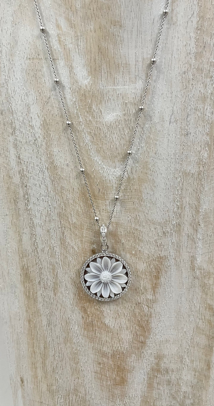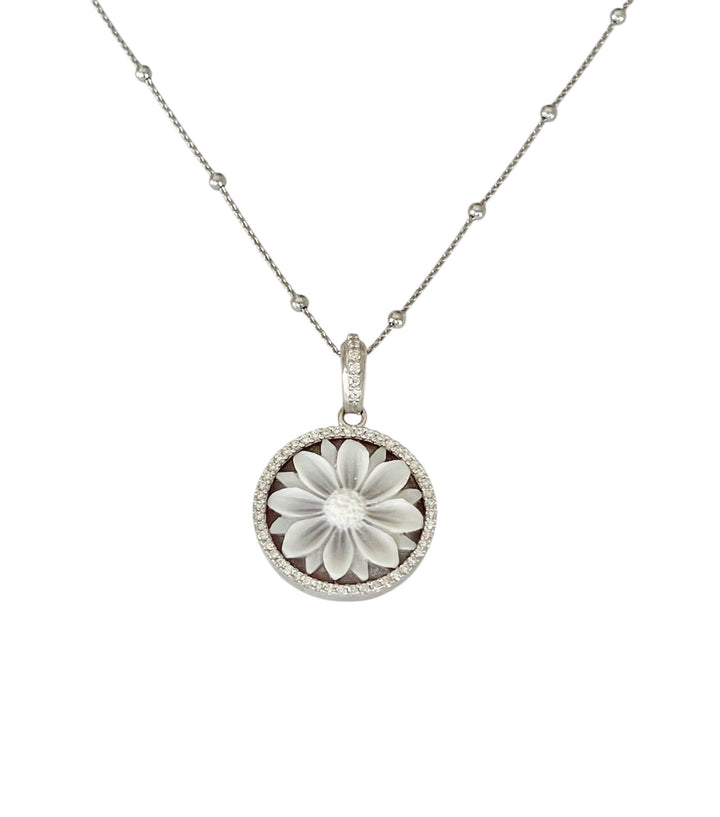 Un gioiello che racchiude la grazia del passato e la luce del presente. Il cameo sardonico, interamente inciso a mano, rivela la delicatezza di un fiore scolpito con maestria, simbolo di femminilità ed eleganza senza tempo. La montatura in argento 925 rodiato, impreziosita da una luminosa cornice di zirconi, esalta ogni dettaglio dell’incisione, donando al gioiello una raffinatezza contemporanea.