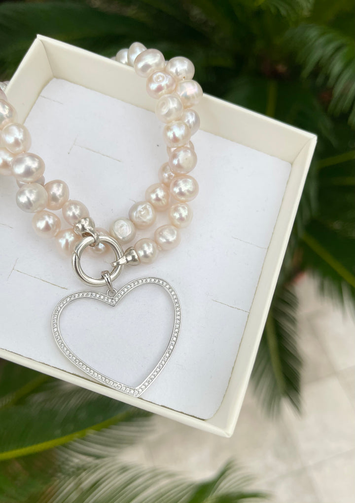 Collana con Perle di Fiume e Cuore in Argento 925 con Zirconi.