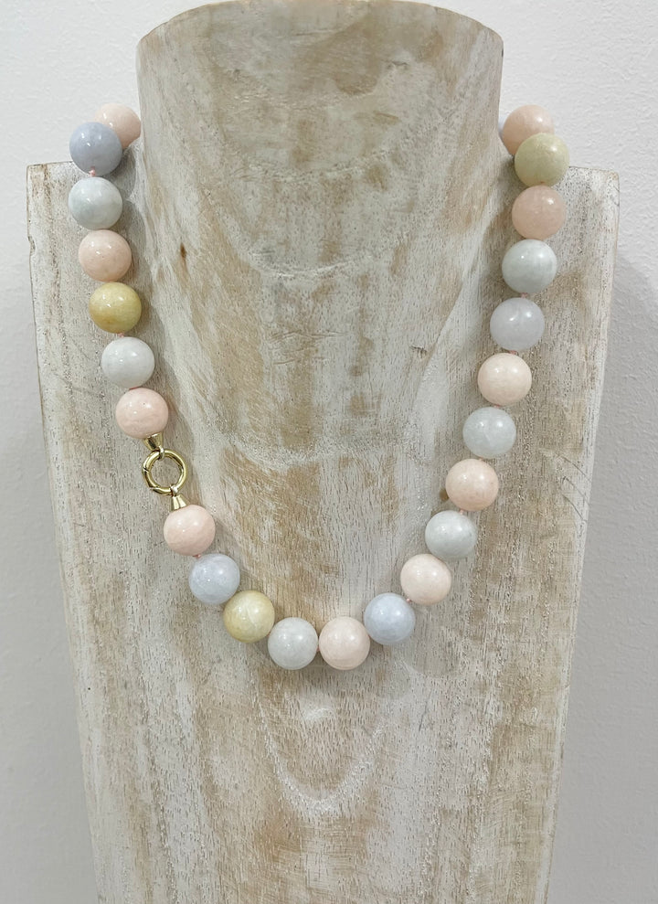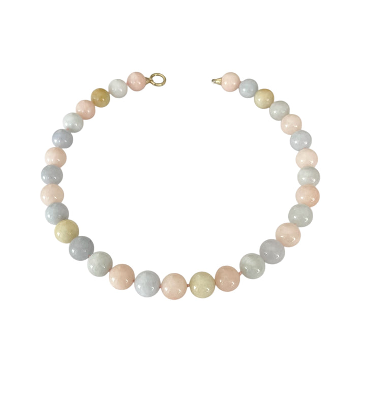 Un viaggio di colori naturali racchiuso in una collana unica: sfere di Giada Tormalina da 14 mm in tonalità celeste, rosso e giallo si alternano creando un gioco di luce e vitalità. Ogni pietra, autentica e naturale, racconta la sua storia, mentre la chiusura in argento 925 dorato aggiunge un tocco di eleganza discreta. Con una lunghezza di 40 cm, questa collana è un piccolo arcobaleno da indossare, capace di illuminare ogni momento con raffinatezza e armonia.