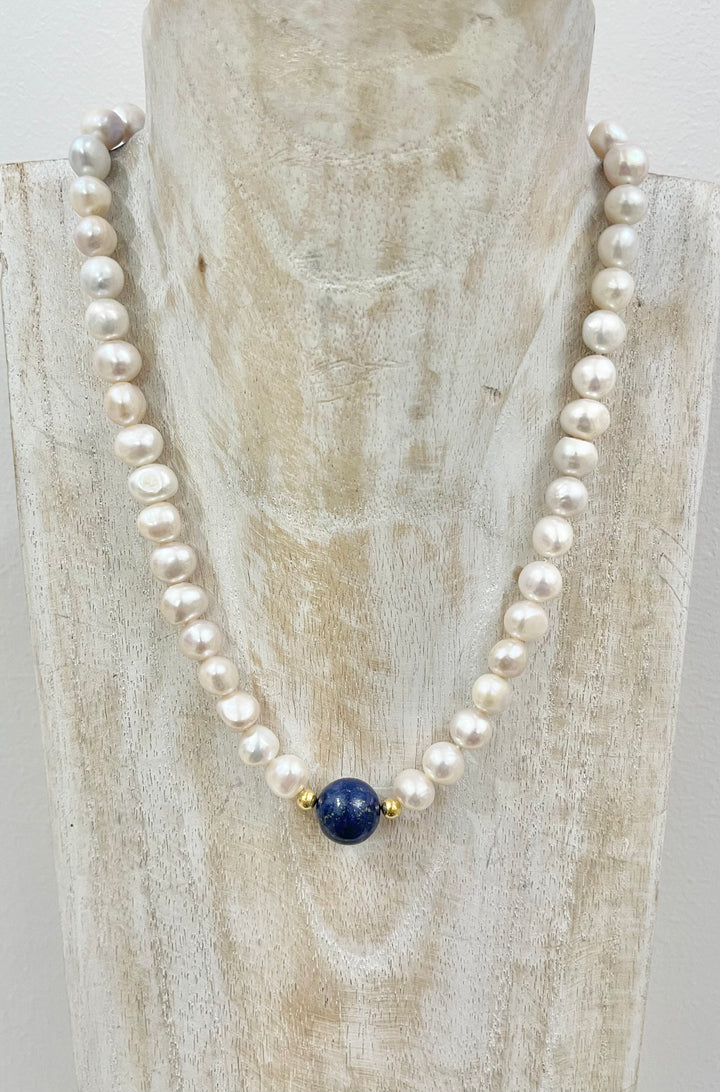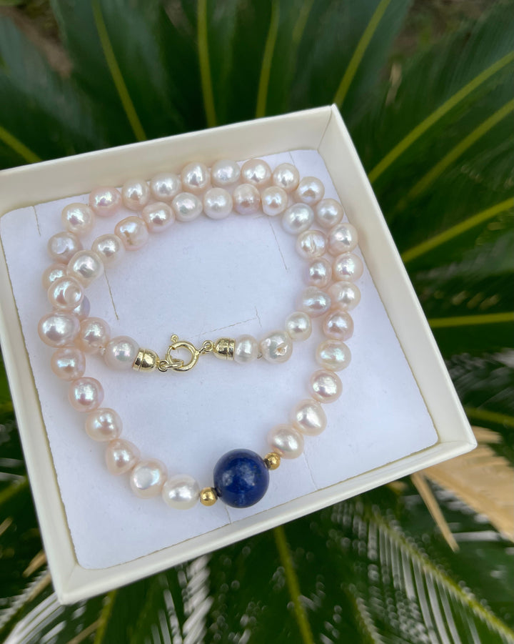 Elegante collana realizzata con perle naturali di acqua dolce, dai delicati riflessi iridescenti, di dimensione 10-11 mm. Al centro, una raffinata sfera di lapis naturale da 12 mm, incorniciata da due sfere in argento 925 dorato, che ne valorizzano la bellezza. La chiusura, anch’essa in argento 925 dorato, completa la collana di 42 cm, rendendola perfetta per donare un tocco di luce e classe a ogni outfit.