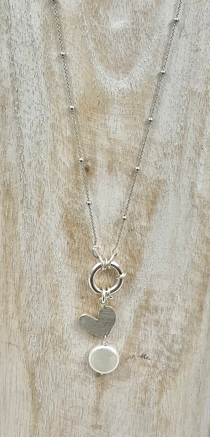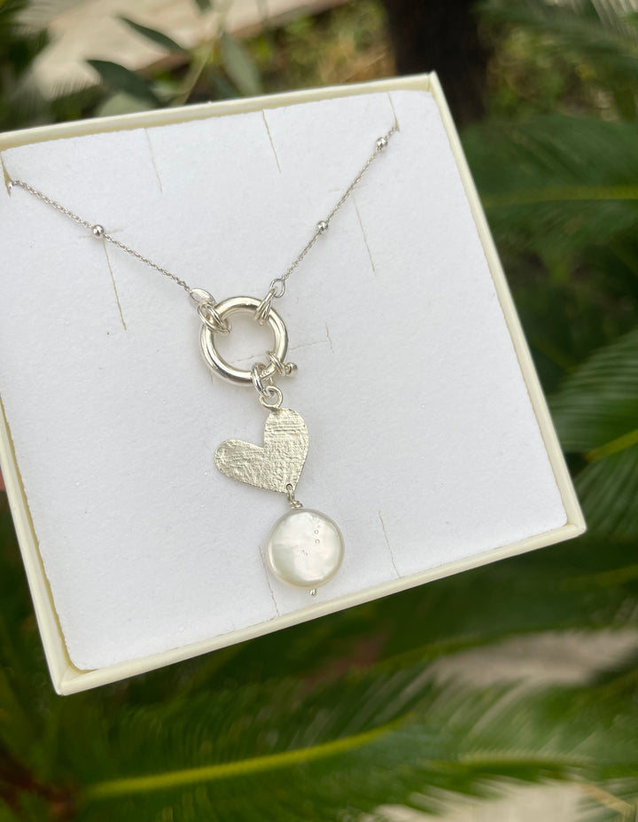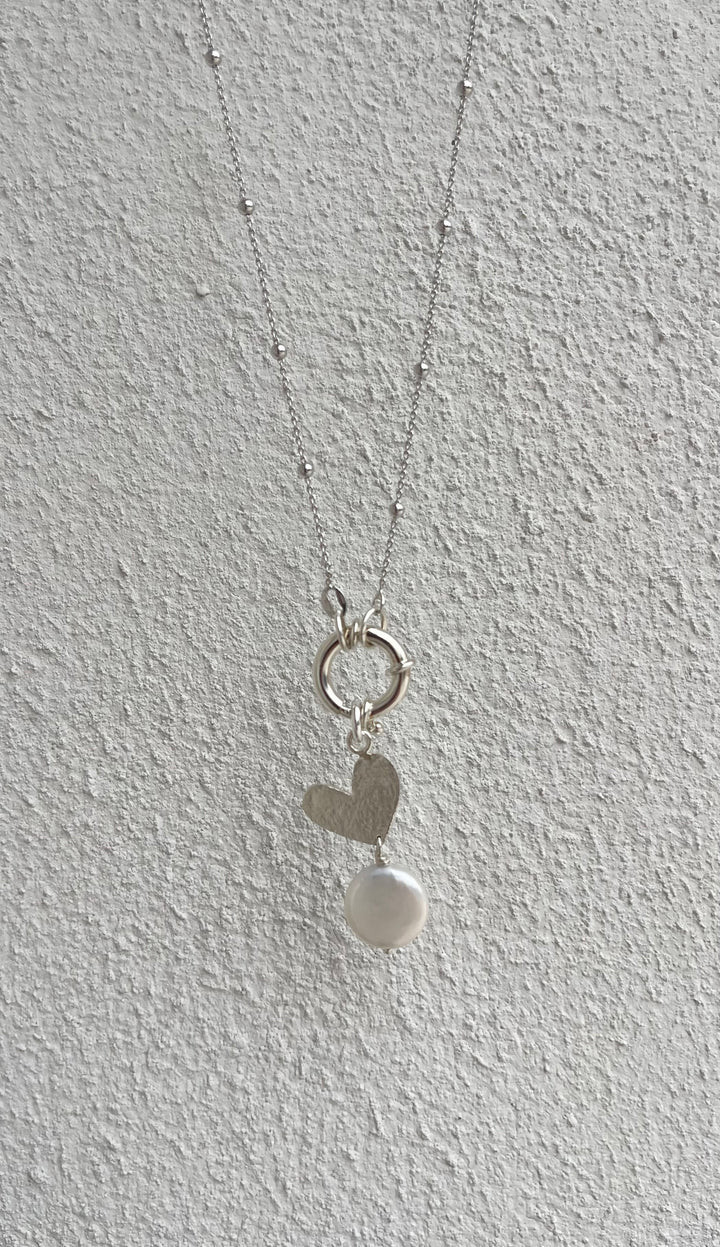 Una collana che racconta storie di eleganza e delicatezza: la catena in argento 925 lunga 60 cm accompagna un raffinato moschettone a ciambella, su cui si posa un piccolo pendente a forma di cuore, interamente realizzato a mano con effetto martellato, custode di luce e artigianalità. Sotto, una perla naturale come un piccolo battito di vita, completa il gioiello con grazia discreta. Una creazione che unisce poesia, luce e armonia, perfetta per chi ama indossare un simbolo di bellezza autentica e personale.