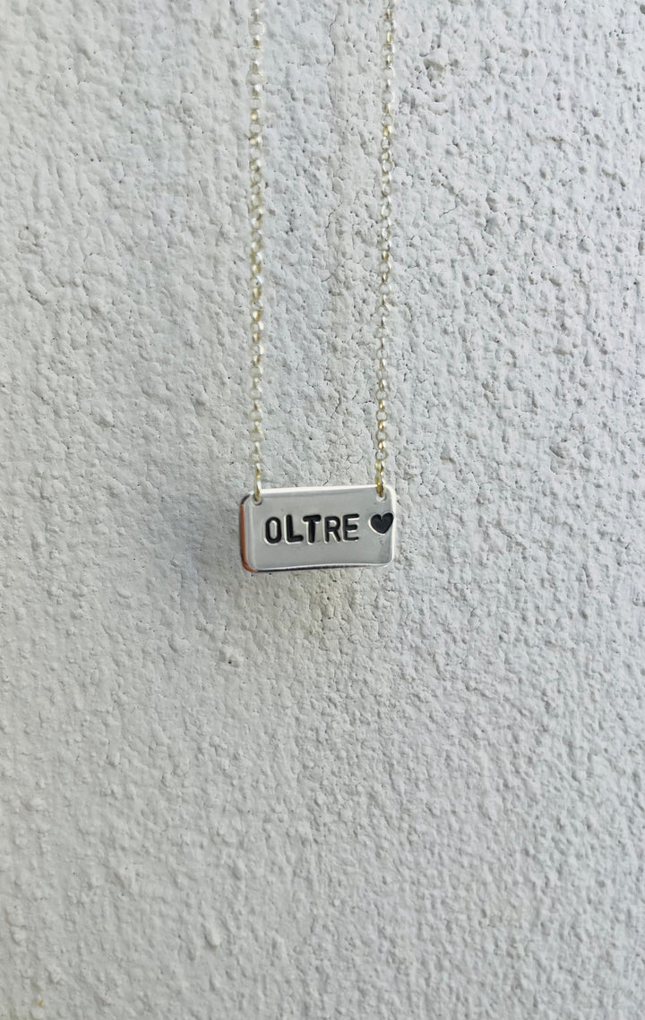 Una collana che parla di confini superati, di sogni che non si fermano mai. “Oltre” è un messaggio inciso nell’argento, un invito a guardare avanti, a credere in ciò che non si vede ancora ma si sente già nel cuore.