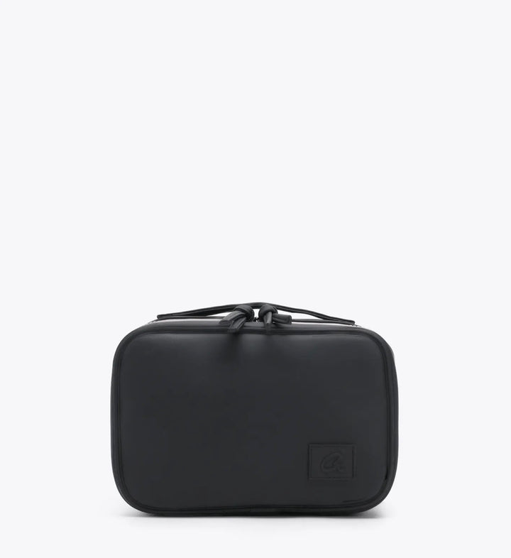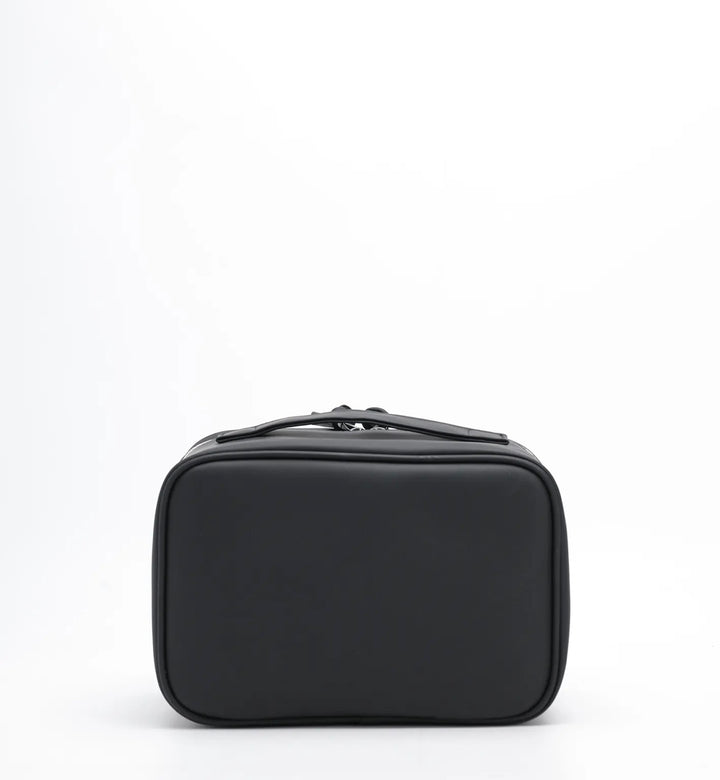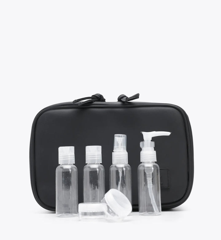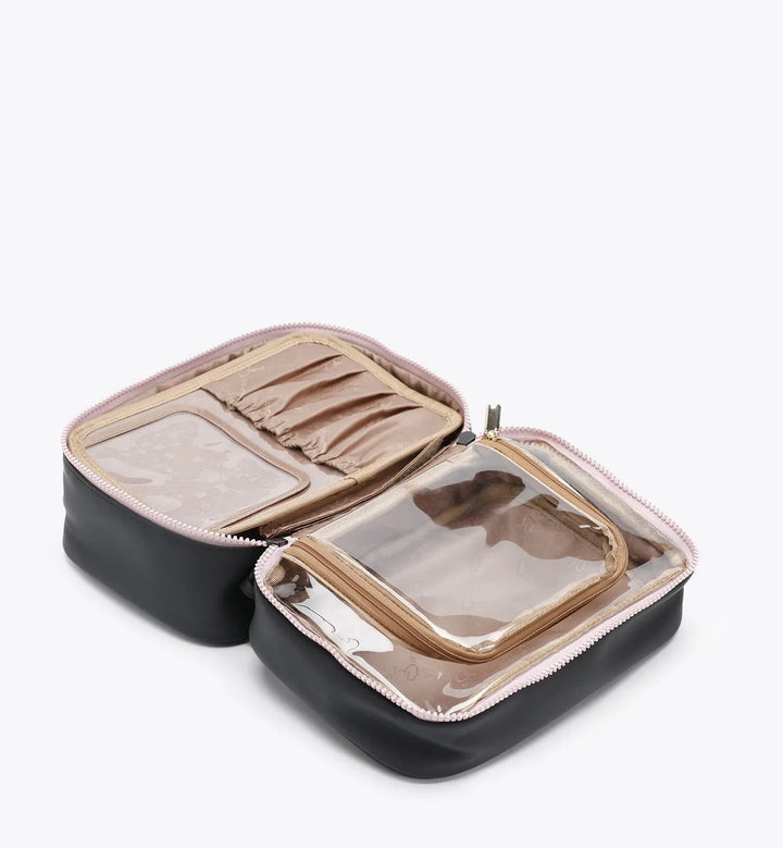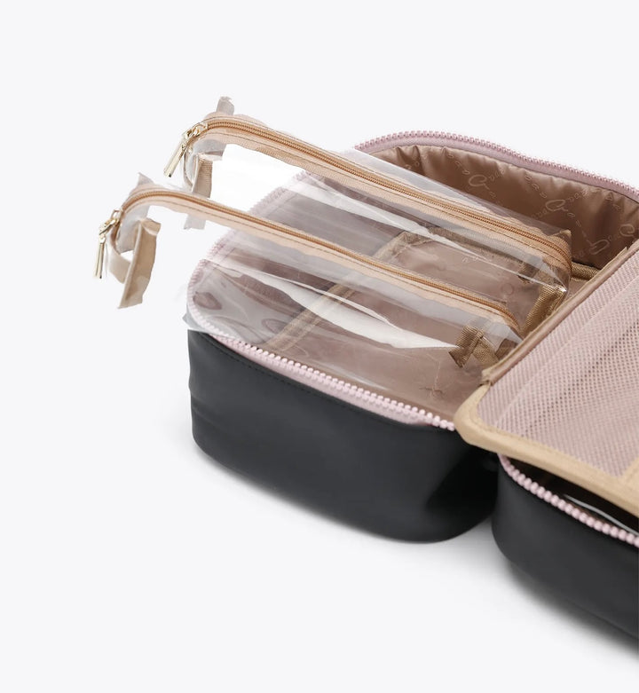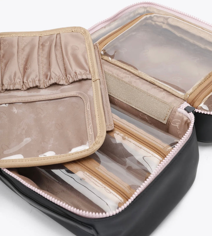 Custodia da viaggio da donna in nero con dettaglio con cerniera rosa. L'interno è foderato e contiene due custodie trasparenti rimovibili, portaspazzole, una custodia trasparente con cerniera e bottiglie vuote per oggetti liquidi. Un accessorio essenziale per ogni viaggio.