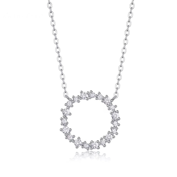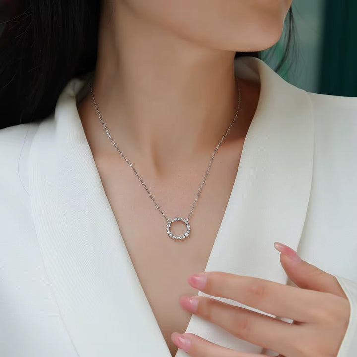 Un cerchio di luce che racconta eleganza e armonia.Questo pendente della Collezione Platinum è realizzato in argento 925 rodiato e impreziosito da splendida moissanite certificata, che dona riflessi brillanti e raffinati. Le gemme incastonate con maestria creano un design delicato e contemporaneo, perfetto per illuminare ogni occasione con classe senza tempo.