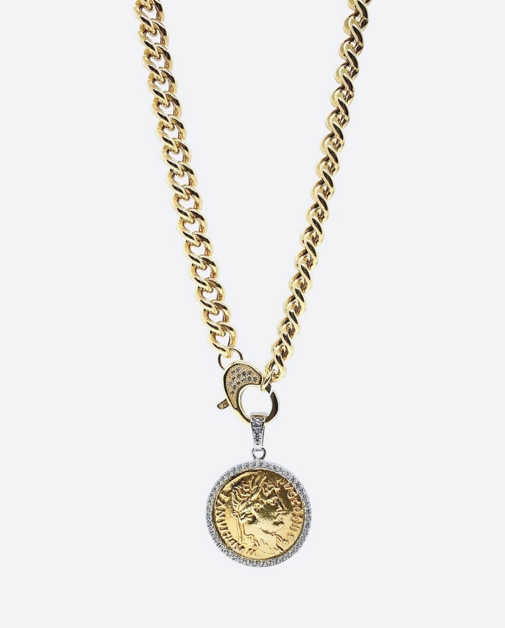 Al centro, un pendente bicolore: una cornice in argento dorato impreziosita da zirconi che racchiude una moneta in stile romano, rimovibile e ricca di fascino antico.