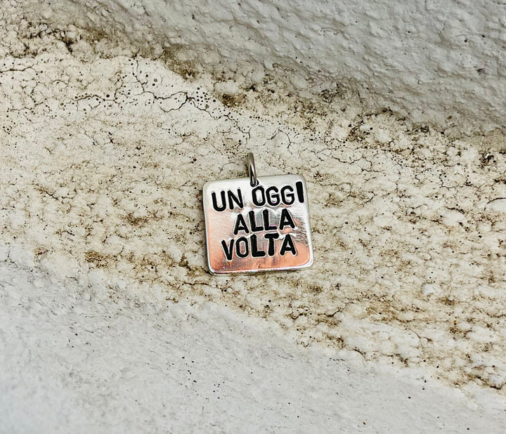 Una piastrina in argento 925, interamente realizzata a mano e incisa con la tecnica dei punzoni. Un gioiello che invita a vivere con calma, ad assaporare ogni giornata senza fretta, trovando forza e serenità nel presente.