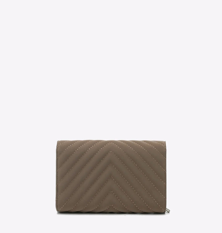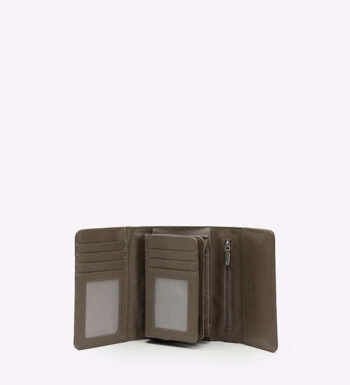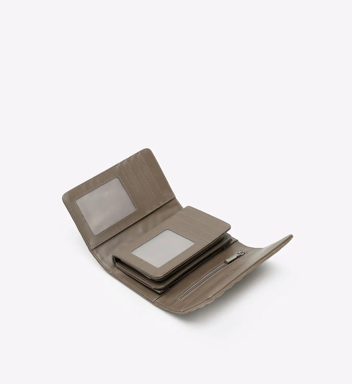 Portafoglio da donna Hilde realizzato in ecopelle speciale con trama in pelle scamosciata e cuciture. All'interno ha più slot per carte e contanti, una custodia e una tasca con cerniera per le monete. Si chiude con una chiusura magnetica nascosta.