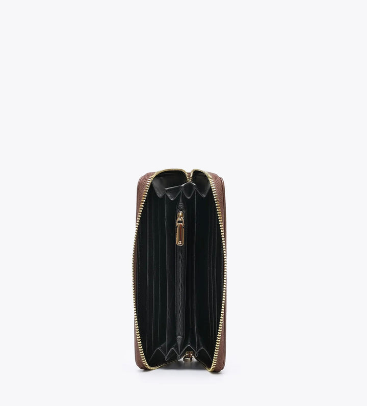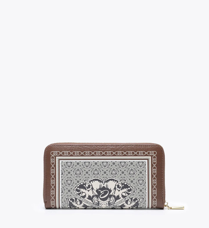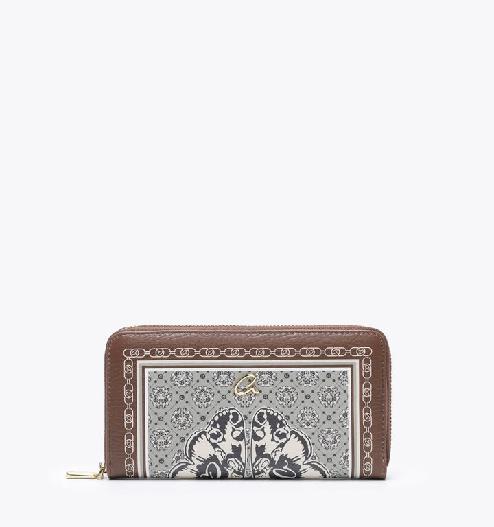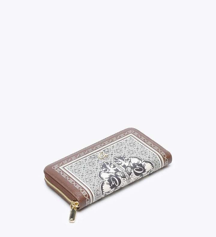 Portafoglio da donna Malin, realizzato in ecopelle con stampa farfalla axel. All'interno contiene uno scomparto per banconote, più slot per carte e uno scomparto centrale con cerniera per le monete. Si fissa con una cerniera in metallo dorato.